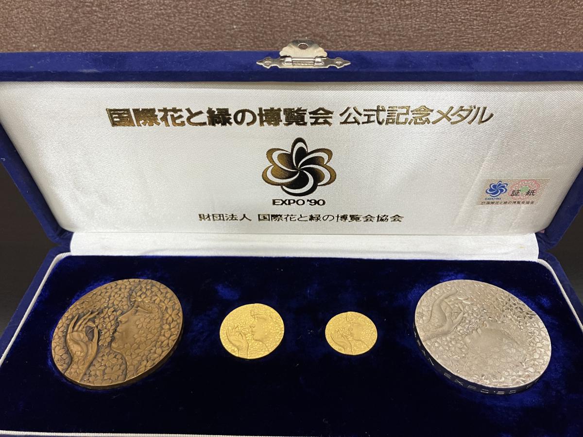記念メダルのお買取です。こちらは国際花と緑の博覧会、通称花博です。開催は1990年。金が2個、銀が1個、銅が1個収められています。1990年といえば平成2年。バブル絶頂期です。金相場は当然今よりもかなり安く、好景気も相まってかなりの数が販売されたのではないかと推測出来ます。どのようなメダルでもおまかせください。おかげさまで13周年!記念メダルのお買取りもおたからや箕面店へ!