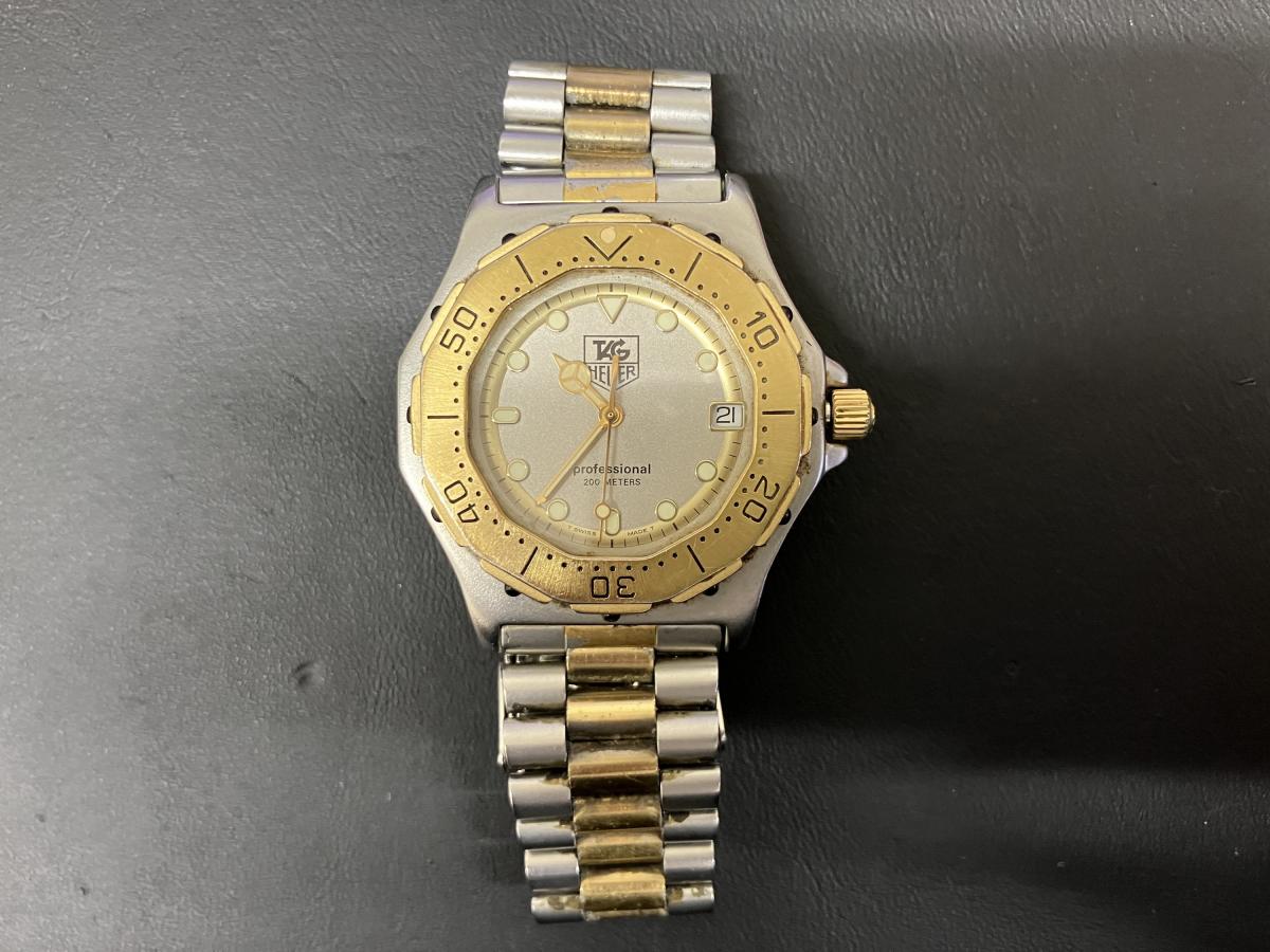 タグホイヤーのお買取です。こちらはプロフェッショナル。タグホイヤーの定番ですね。機械はクオーツでメンズとなります。数年使っていないということで、電池切れの状態。動いておりませんがお買取は可能です。ぜひおまかせください。おかげさまで13周年!タグホイヤーのお買取りもおたからや箕面店へ!