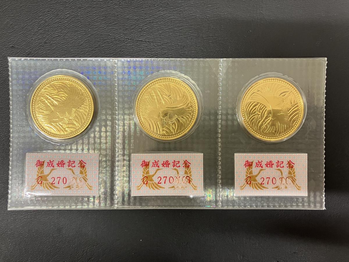 金貨のお買取です。こちらは皇太子殿下御成婚記念5万円金貨。今の令和天皇です。3枚セットでお買取させて頂きました。十数年前は1枚当たりの買取金額も55000円から60000円ぐらいでしたが、今ではとんでもない金額になっております。ぜひおまかせください。おかげさまで13周年!金貨・銀貨のお買取りもおたからや箕面店へ!