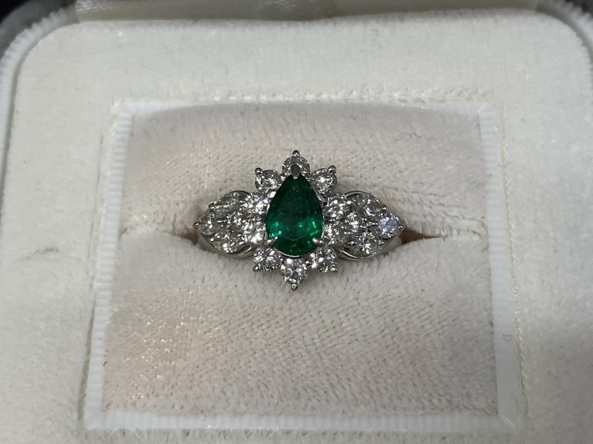 エメラルドリングのお買取です。エメラルドは0.65カラット。取り巻きのメレーダイヤは0.98カラットございます。枠はプラチナが使われています。エメラルド、ダイヤモンド、プラチナ、デザイン性など総合的に査定致します。ぜひおまかせください。おかげさまで13周年!エメラルドのお買取りもおたからや箕面店へ!