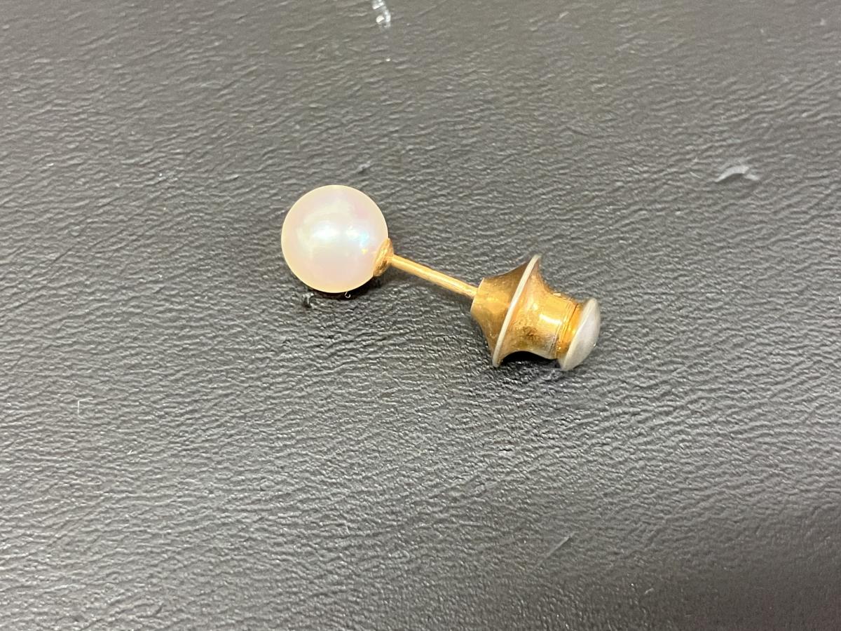タイピンのお買取です。よく見るパールのタイピン。パール自体はお値段が付くような珠ではございませんが、ピンの部分にK18が使われております。ピン自体細いですが、こちらにお値段が付きます。ちなみにキャッチは貴金属ではないため、お値段は付きません。細かい部分も見逃しません。ぜひおまかせください。おかげさまで13周年!金・プラチナ・ダイヤモンドのお買取りもおたからや箕面店へ!
