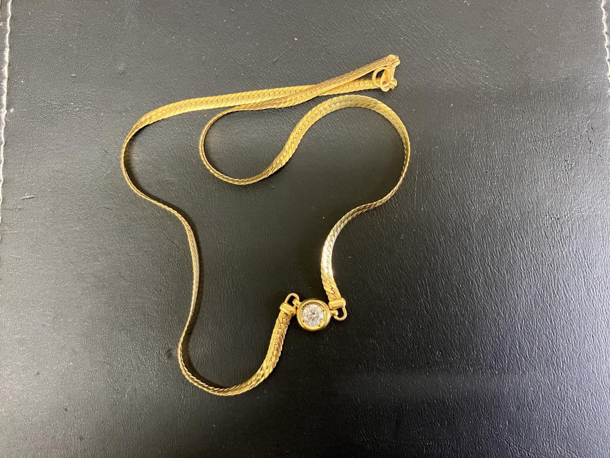 ダイヤモンドネックレスのお買取です。チェーンはK18。ダイヤモンドのカラット数は0.78です。ゴールド枠でしっかりとダイヤモンドの全体をホールドしており、テーブルぐらいしか見えていないので、カラー、カットに関して判断するのは非常に難しいですが、分かる範囲の全ての情報を基にしっかりとダイヤモンドも査定しております。ぜひおまかせください。おかげさまで14周年!金・プラチナ・ダイヤモンドのお買取りもおたからや箕面店へ!
