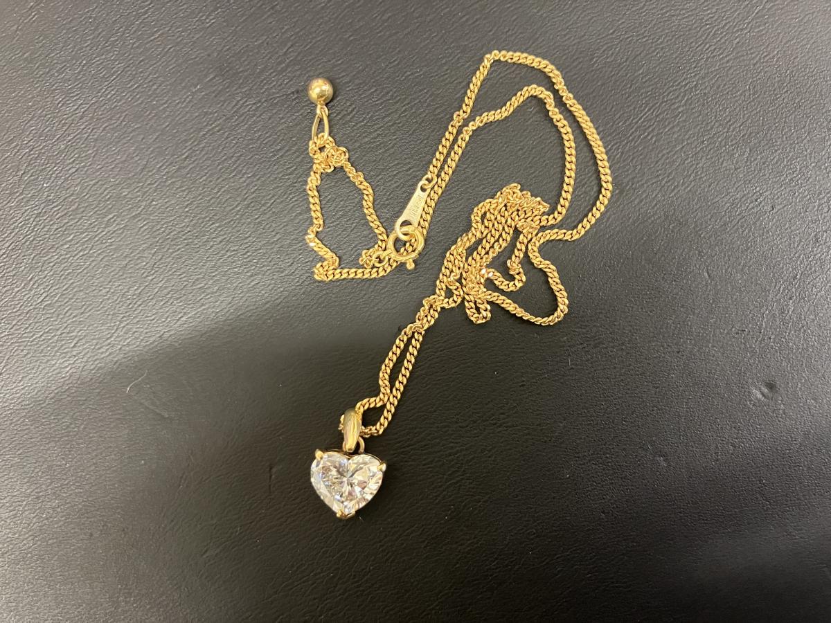 ダイヤモンドネックレスのお買取です。ゴールド枠でハートシェイプではありますが、2.2カラットございます。なかなかの大粒。しっかりと査定致します。ぜひおまかせください。おかげさまで14周年!金・プラチナ・ダイヤモンドのお買取りもおたからや箕面店へ!